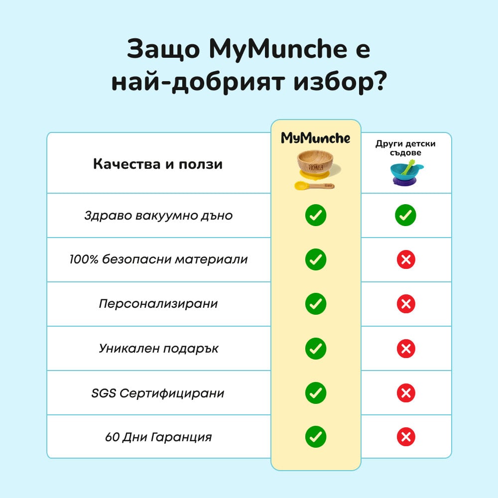 Държим на качеството. Особено що се отнася до продукти, които децата ни използват всекидневно. Ето защо подбрахме производители, които изпитват всеки от компонентите, съставящи крайния продукт. Артикулите на MyMunche са преминали регламентираните от ЕС тестове за безопасност.