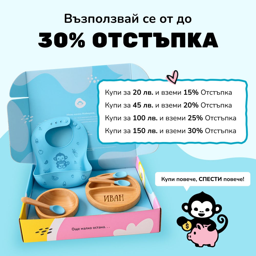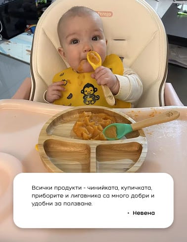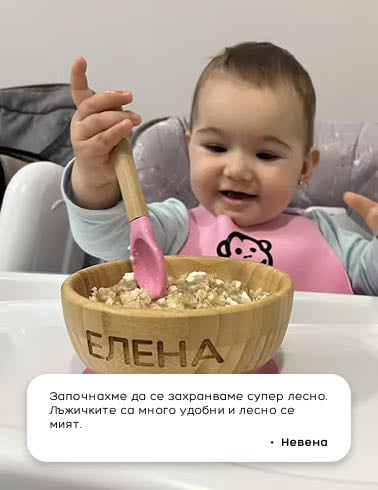 • Силиконова лъжичка с бамбукова дръжка – 14 см дължина на цялата лъжичка; 5 см дължина и 3 см ширина на силиконовата част (това е частта, от която детето всъщност похапва)