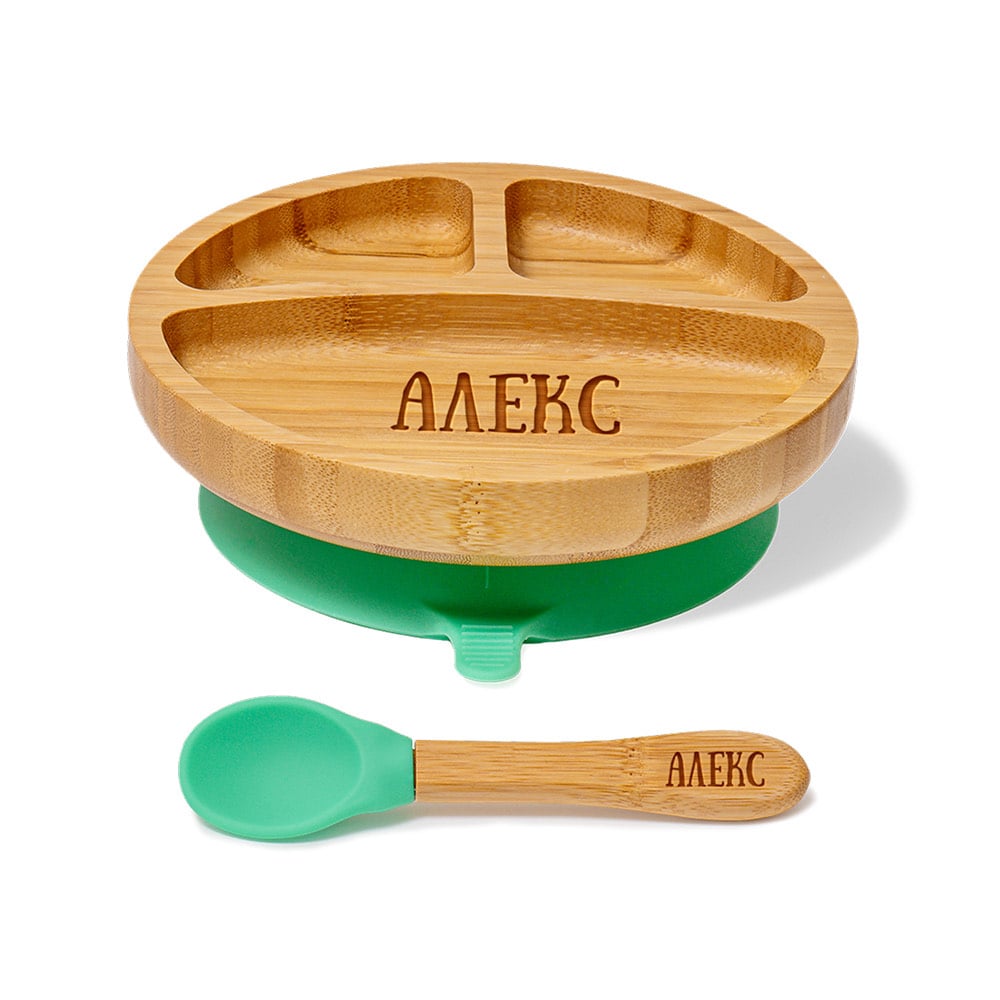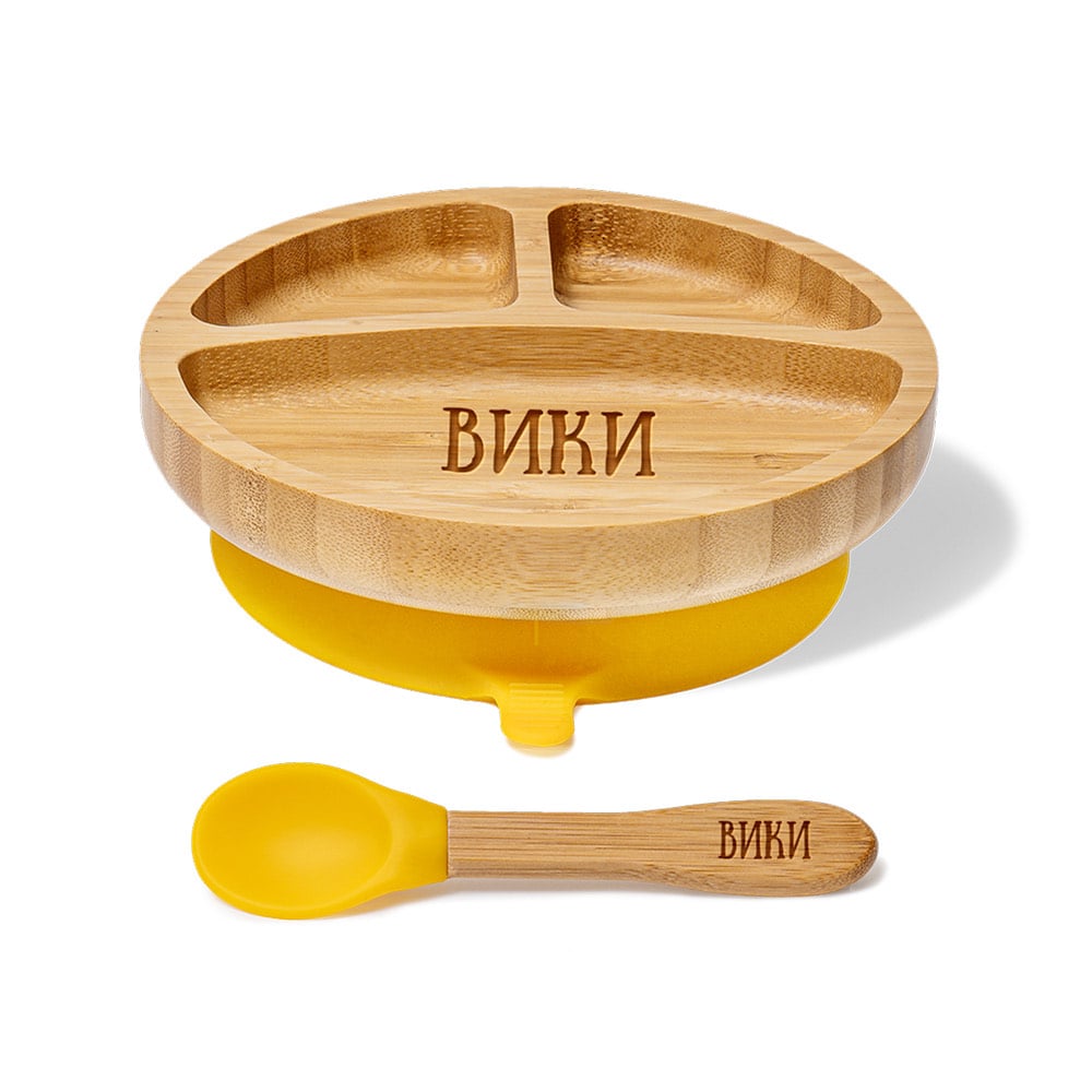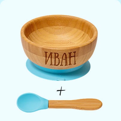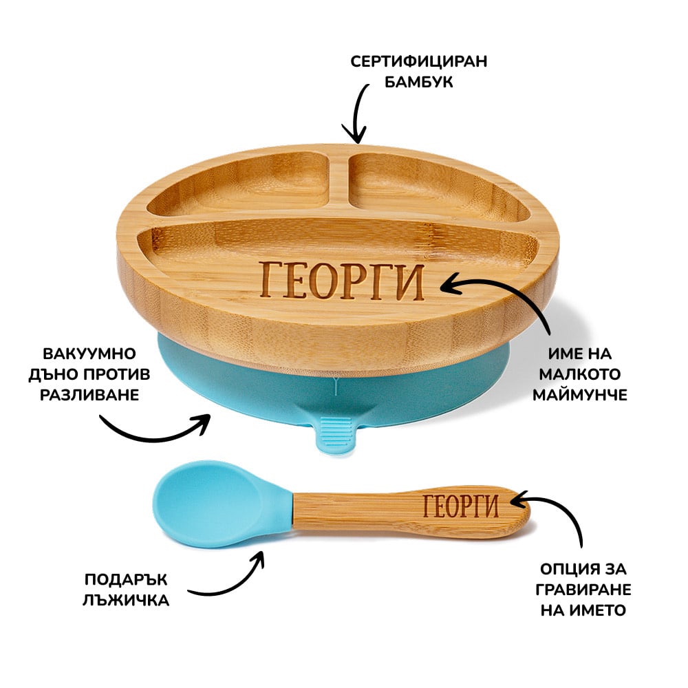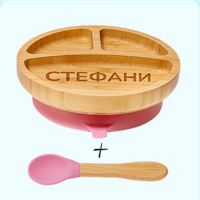 Бамбуковата чинийка с лъжичка MyMunche е удобен комплект за бебета и малки деца, който се захваща стабилно за масата.