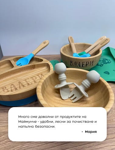 Бамбуковата чинийка с лъжичка MyMunche е приятел както на децата, така и на родителите. Силиконовият пръстен, който захваща чинийката и играе ролята на вакуумно дъно, ‘залепва’ здраво за масичката за хранене и не позволява на малките палавници да обърнат всичко с главата нагоре.