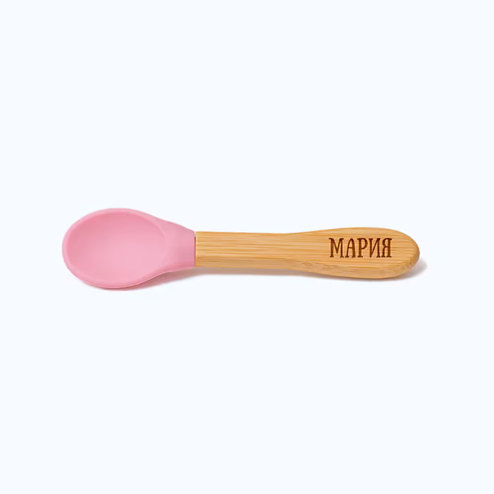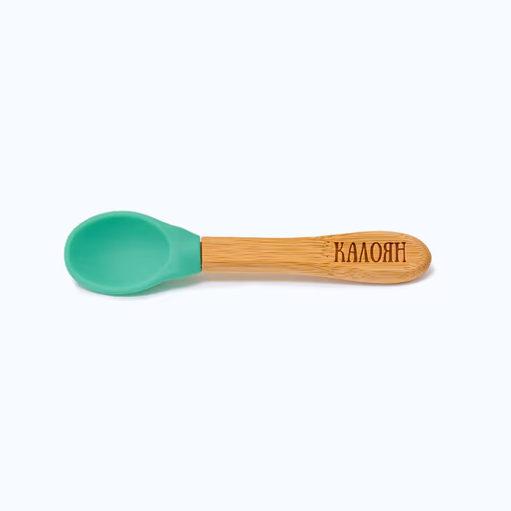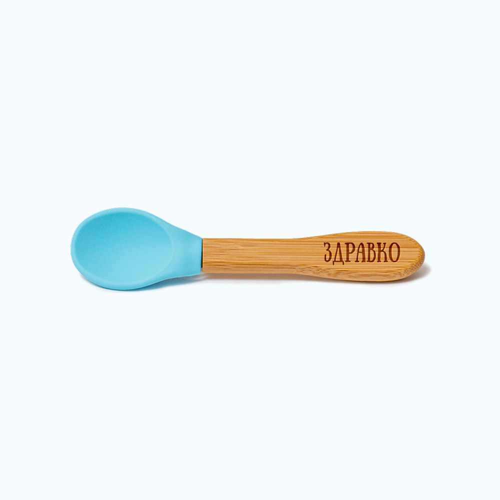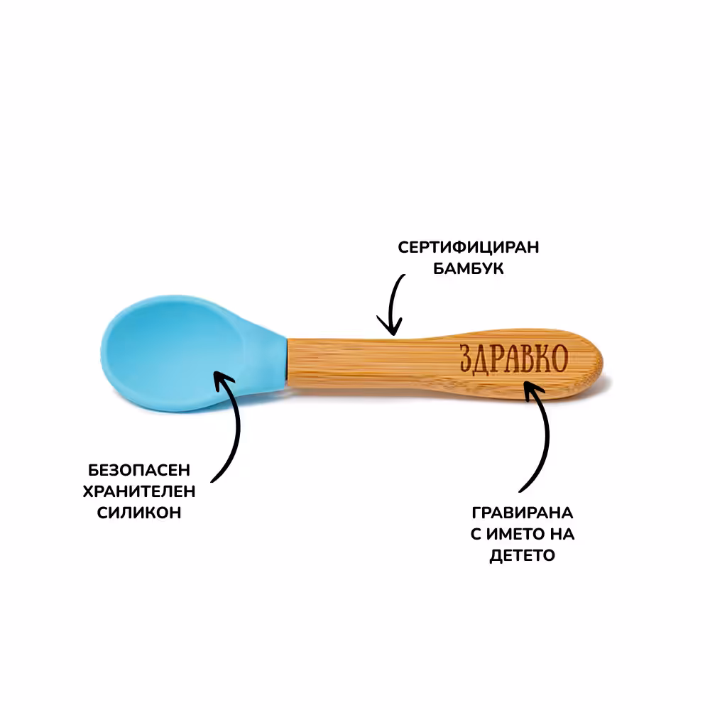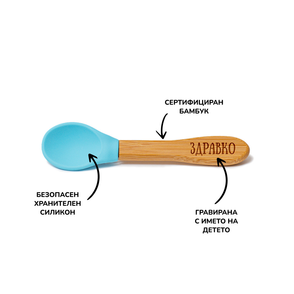 Силиконова лъжичка с бамбукова дръжка – 14 см дължина на цялата лъжичка; 5 см дължина и 3 см ширина на силиконовата част (това е частта, от която детето всъщност похапва)