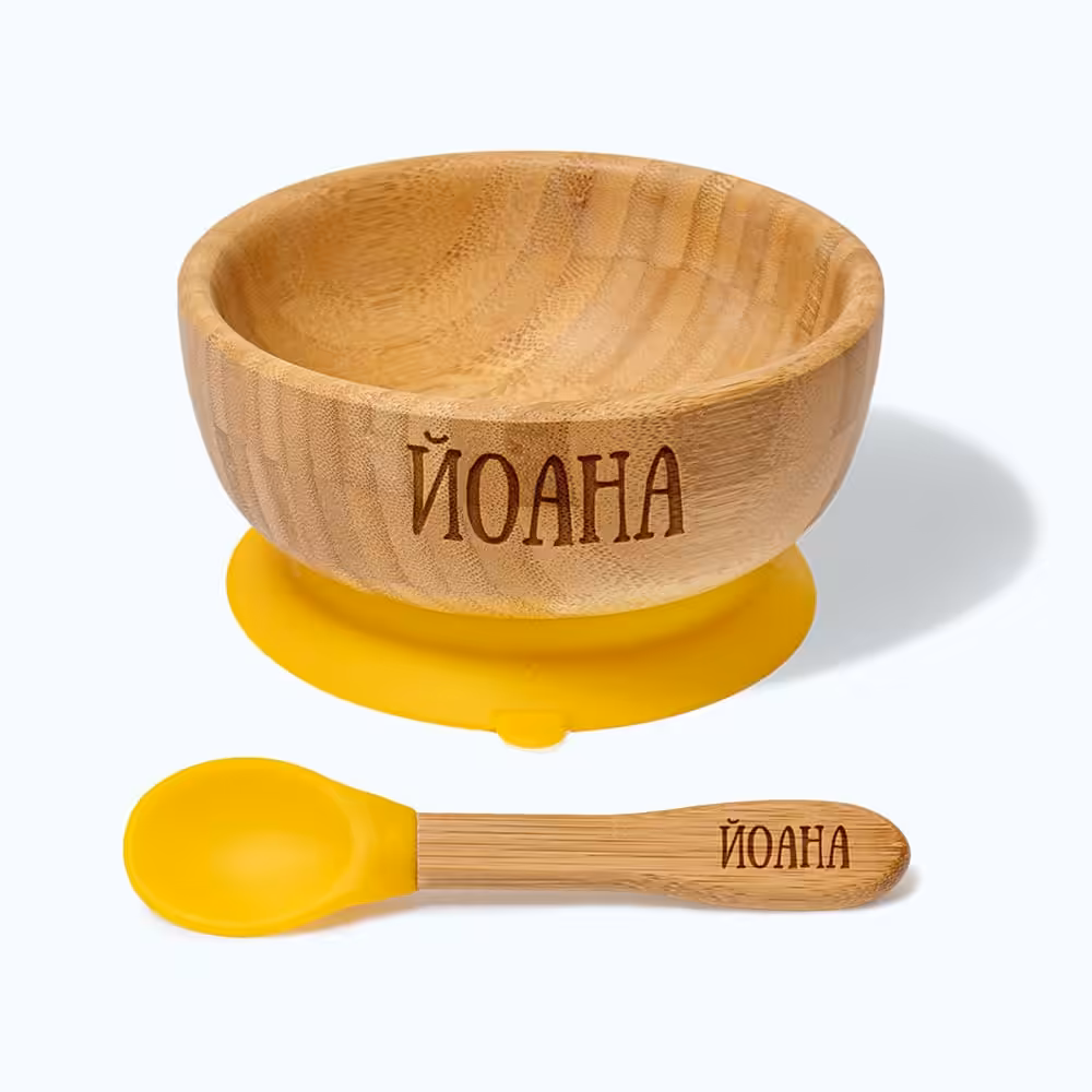 Бамбуковата купичка с лъжичка MyMunche е удобен комплект за бебета и малки деца, който се захваща стабилно за масата.