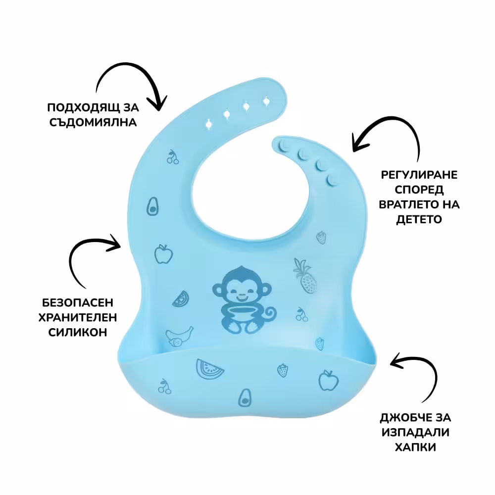 Силиконовият лигавник MyMunche е водоустойчив, напълно непромокаем. А в края си завърша с джобче, което събира храната, която не успява да улучи устата на палавото малко маймунче или пък бебчо настойчиво плюе.