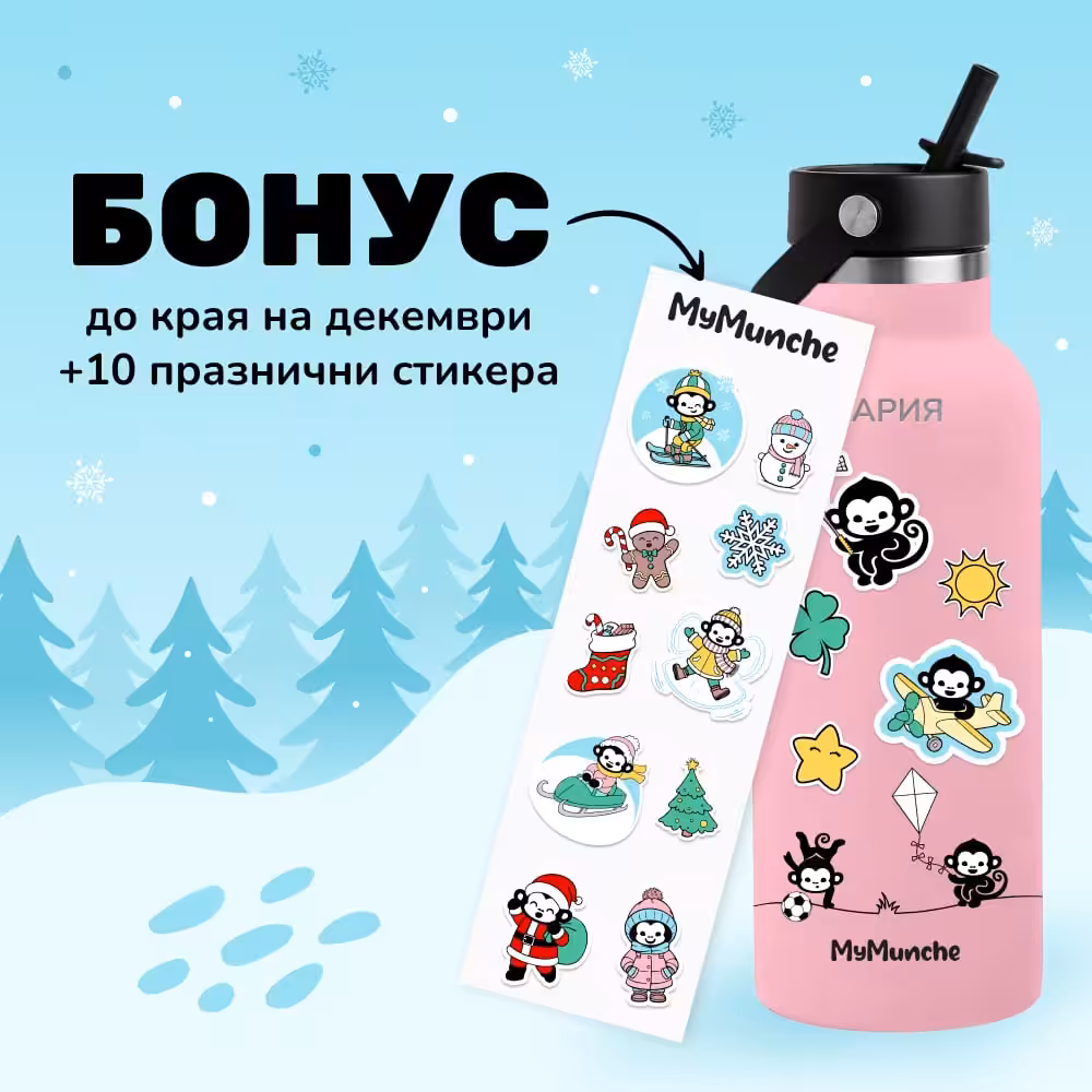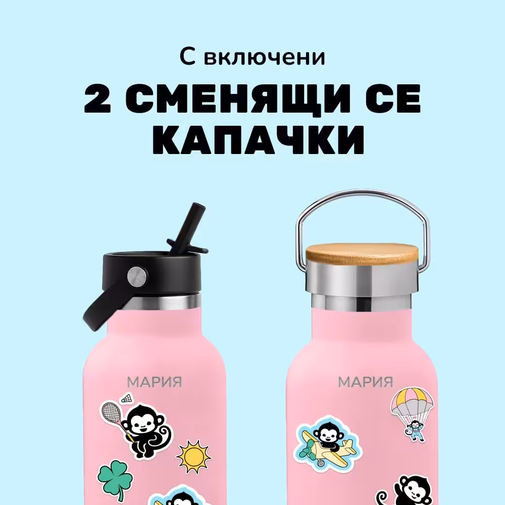 С вместимост 550 мл, двойна стена от неръждаема стомана и две сменящи се капачки, тя осигурява удобство и свежест без протичане. Силиконовият предпазител на дъното гарантира здравина при игра.